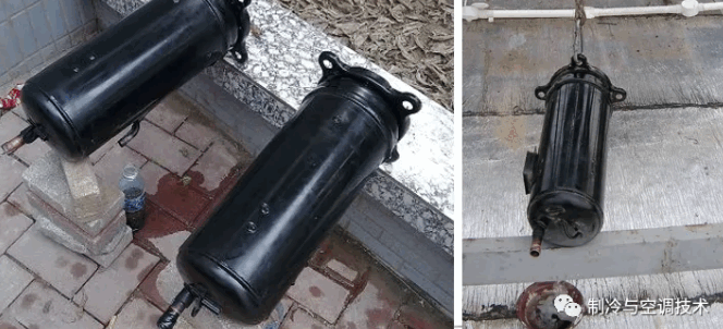 1、拆下故障压缩机,用图示方法将压缩机油倒出。检查油量和油质。正常情况下压缩机侧向放倒后冷冻机油会从排气管流出。如果没有油流出或者油量很少,表明压缩机缺油。