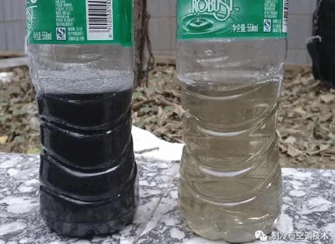 左侧的冷冻机油已经明显炭化变质,此时只是简单更换压缩机有可能导致压缩机机型损坏!右侧是机组正常运行之后轻微泛黄的正常油质。