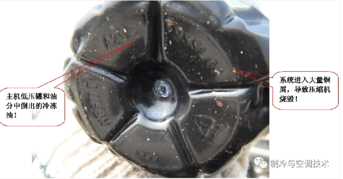 投入使用后,氧化皮进入压缩机污染冷冻油,且随着机组的运行,冷冻油被污染的程度加重,导致润滑性能下降,且随着氧化皮在压缩机中逐渐积累,压缩机泵油量逐渐下降,导致曲轴运动副和涡旋盘润滑不良,产生磨损和高温;高温导致冷冻油碳化分解,进一步加剧磨损和高温,最终导致抱轴,电机烧毁。