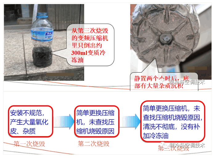 之后,网点频繁更换变频压缩机而不检查系统油量油质情况,且不追加冷冻油,导致系统油量越来越少,油质越来越恶劣,最终导致压缩机频繁烧毁,且时间间隔越来越短。