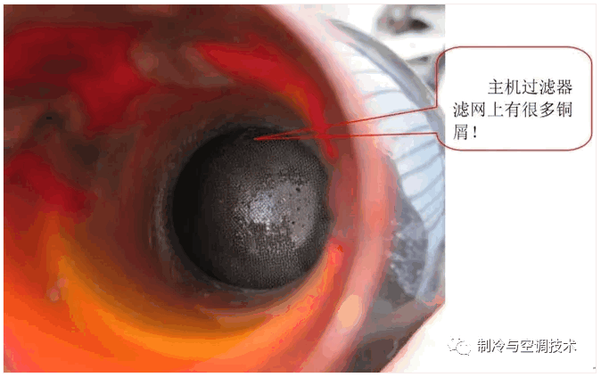 3、将室外机油分离器和低压罐中的冷冻机油倒出,检查油质是否发黑变质,是否有铜屑氧化皮等杂质。检查室外机总回气管、回油毛细管组件的过滤器和压缩机回气管的过滤网,看有无明显杂质。